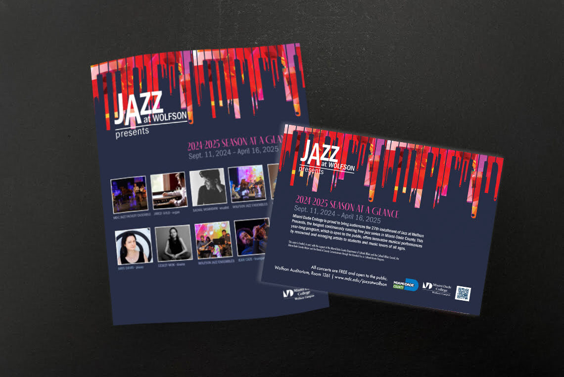 The award-winning Jazz at Wolfson Presents campaign promoted an entire season of 10 live performances which ran from September through April at MDC, marking the 25th anniversary of the longest continuously running free jazz concert series in Miami-Dade County. The campaign included a postcard, season booklet, digital and outdoor signage, eblasts, social media, posters, radio spots and individual performance programs featuring in-depth artist profiles for each of the live performances.